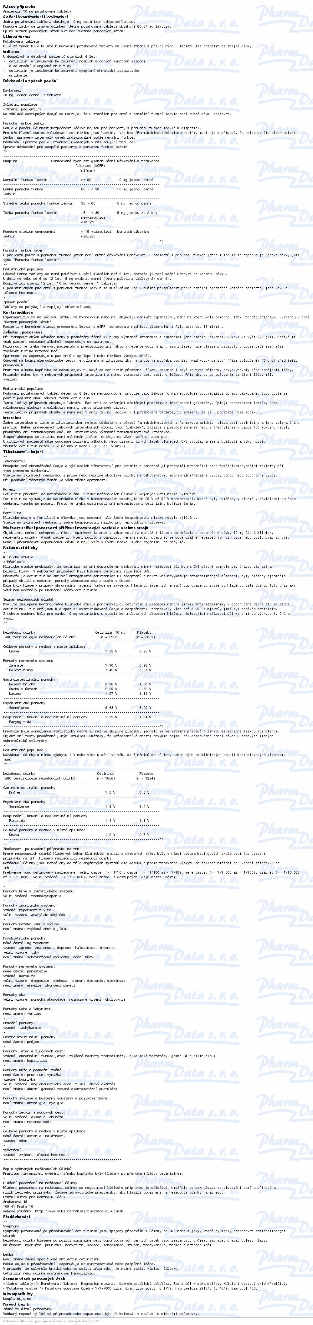 Léčivou látkou přípravku Analergin je cetirizin-dihydrochlorid.Analergin je přípravek proti alergiím. Přípravek se používá ke zmírnění nosních a očních příznaků sezónní a celoroční alergické rýmy; ke zmírnění příznaků chronické kopřivky nejasného původu. Čtěte pozorně příbalový leták. číst více