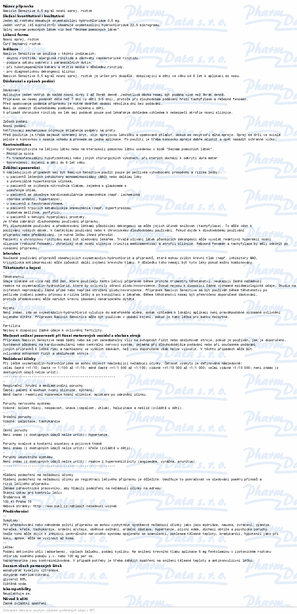 Nasivin Sensitive 0,05% sprej s odměřeným dávkováním je lék určený pro dospělé a děti od 6 let pro podání do nosu. Vyvolává snížení překrvení sliznic. Kromě toho byly u léčivé látky prokázány protivirové, imunomodulační, protizánětlivé účinky. Čtěte pozorně příbalový leták. číst více