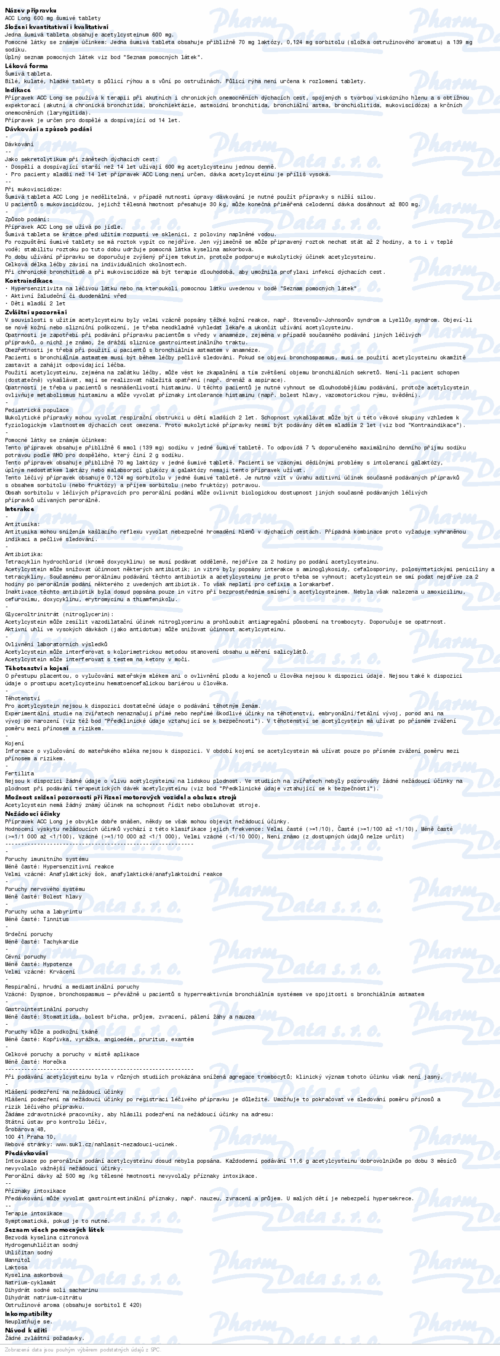 ACC LONG je mukolytikum. Léčivá látka acetylcystein rozpouští všechny složky, které způsobují vazkost hlenu. Tím snižuje vazkost hlenu a usnadňuje vykašlávání. Šumivé tablety s ostružinovým aroma. Čtěte pozorně příbalový leták. číst více
