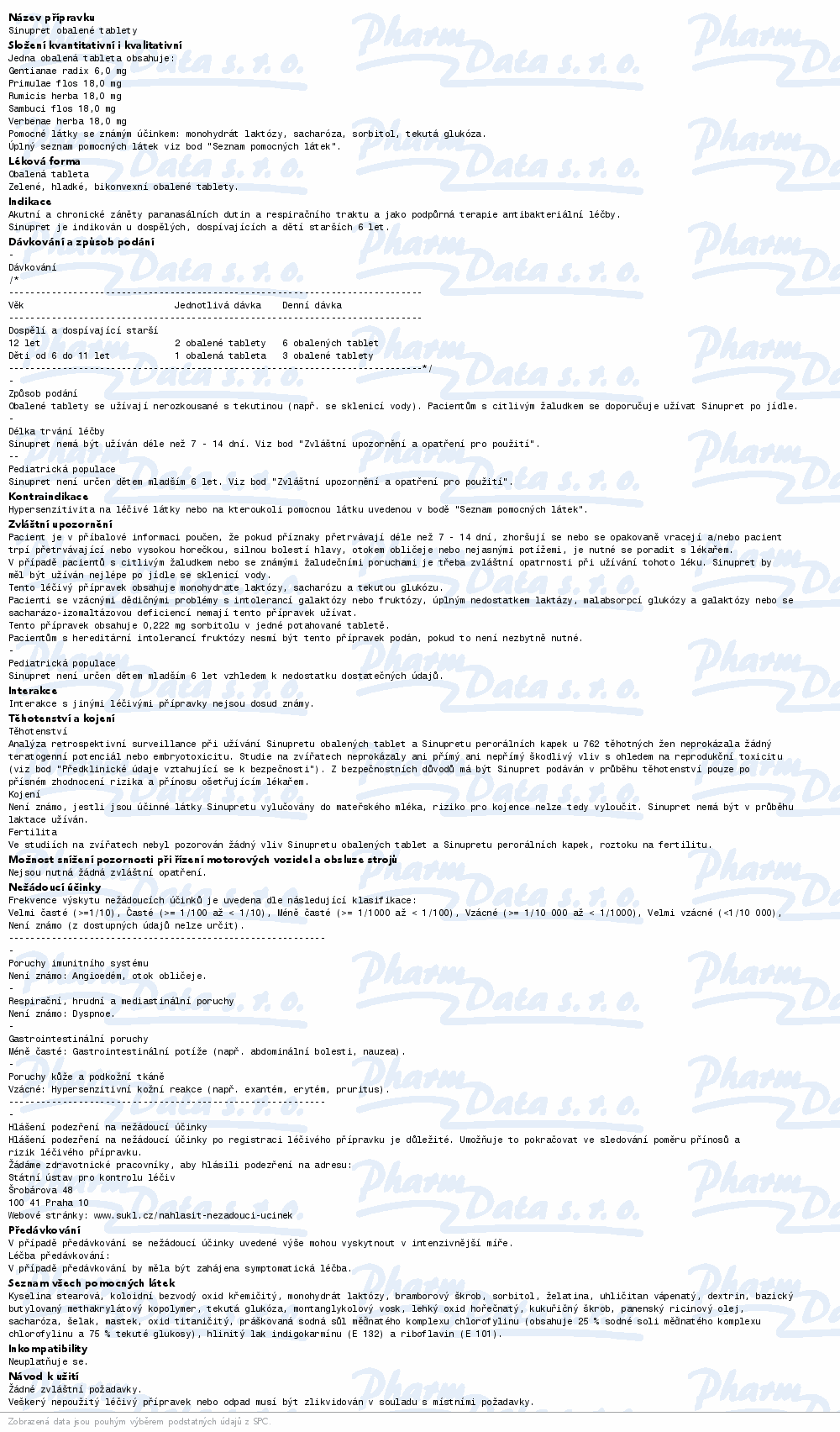 Sinupret se užívá při akutních a chronických zánětech vedlejších dutin nosních a dýchacích cest a jako podpůrná léčba při antibiotické léčbě. Sinupret působí sekretolyticky tím, že zvyšuje tvorbu, rozpouštění a vykašlávání hlenů z dýchacích cest. Čtěte pozorně příbalový leták. číst více