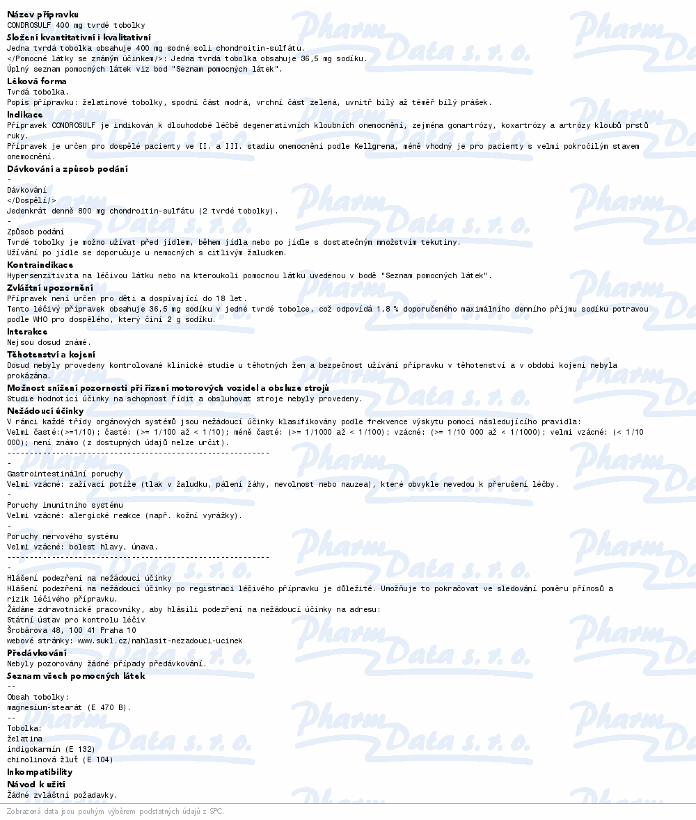 CONDROSULF je indikován k dlouhodobé kontinuální léčbě degenerativních kloubních onemocnění, zejména gonartrózy, koxartrózy a artrózy kloubů prstů ruky. Přípravek je určen pro dospělé pacienty ve II. a III. stadiu onemocnění podle Kellgrena. Čtěte pozorně příbalový leták. číst více