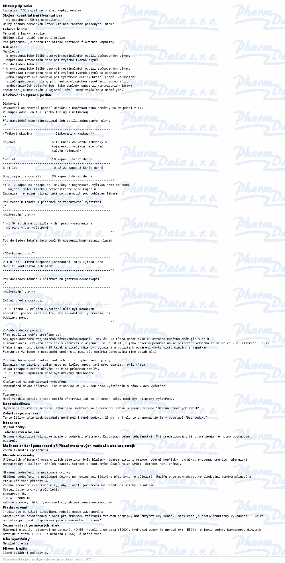 Espumisan je léčivý přípravek, který účinně odstraňuje pocit tlaku v břiše, pocit plnosti a plynatost. Espumisan může být užíván dlouhodobě, nemá vliv na trávení, i bez zapití se snadně polyká a je bezpečný i pro těhotné ženy a kojící matky. Čtěte pozorně příbalový leták. číst více