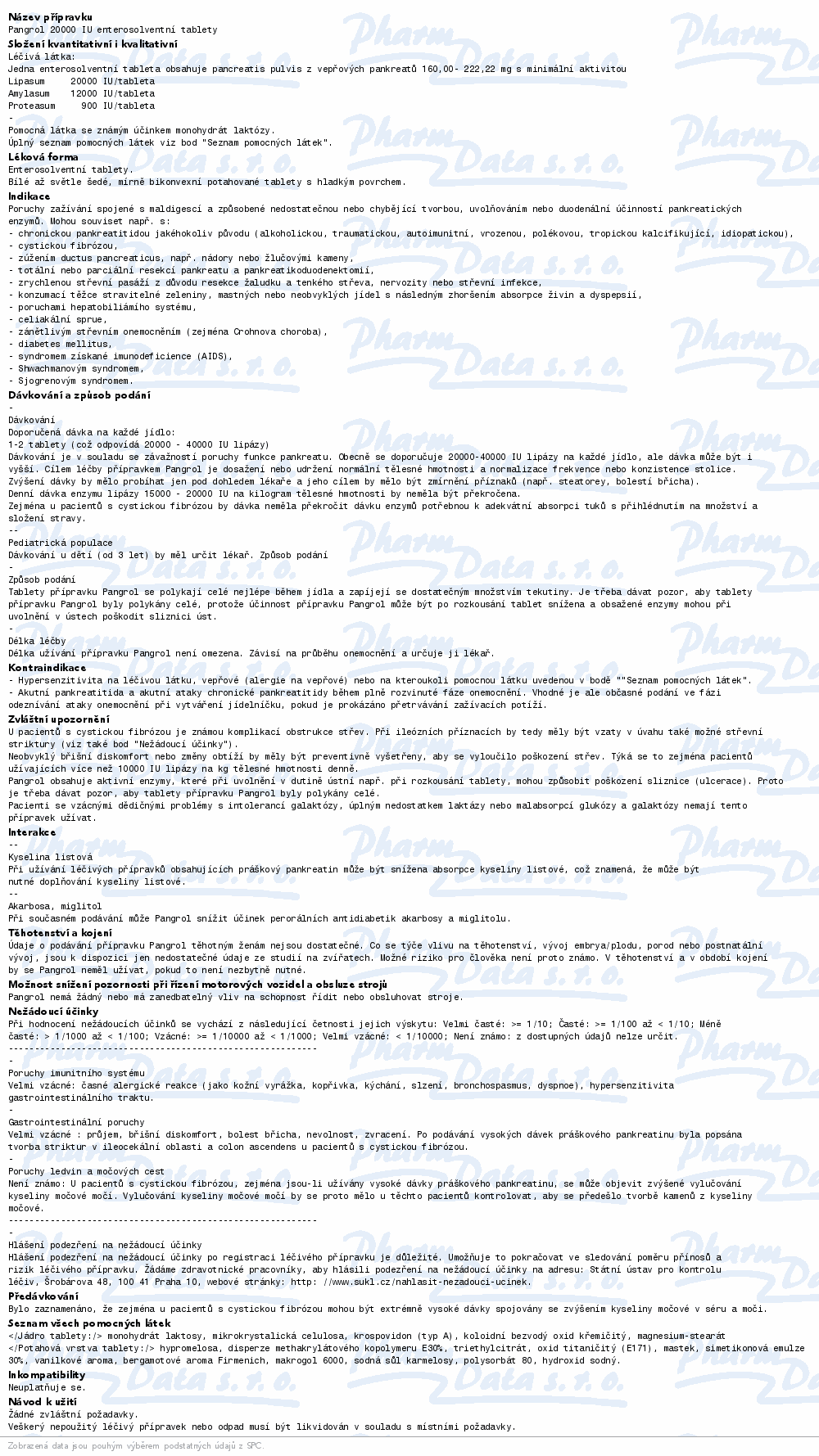 Pangrol 2000 enterosolventní tablety 20 II je lék,který obsahuje látky podporující trávení ze slinivky břišní vepřů (prášový pankreatin).Pangrol je určen k podporě trávení a vstřebávání potravy při problémech s enzymy z slinivky břišní. Čtěte pozorně příbalový leták. číst více